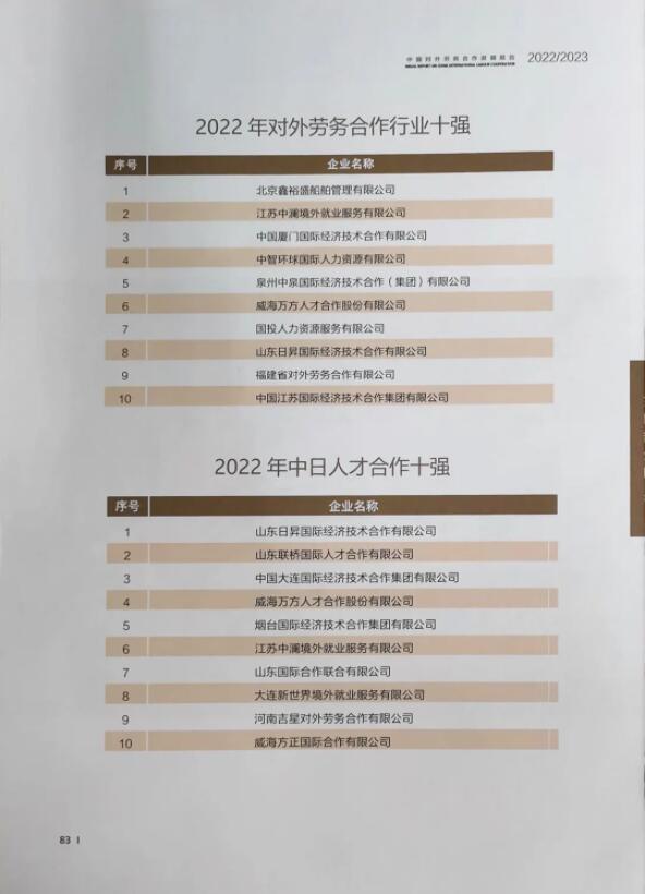 萬方人才公司再次榮登“對外勞務合作行業(yè)十強企業(yè)”、“中日人才合作十強企業(yè)”榜單